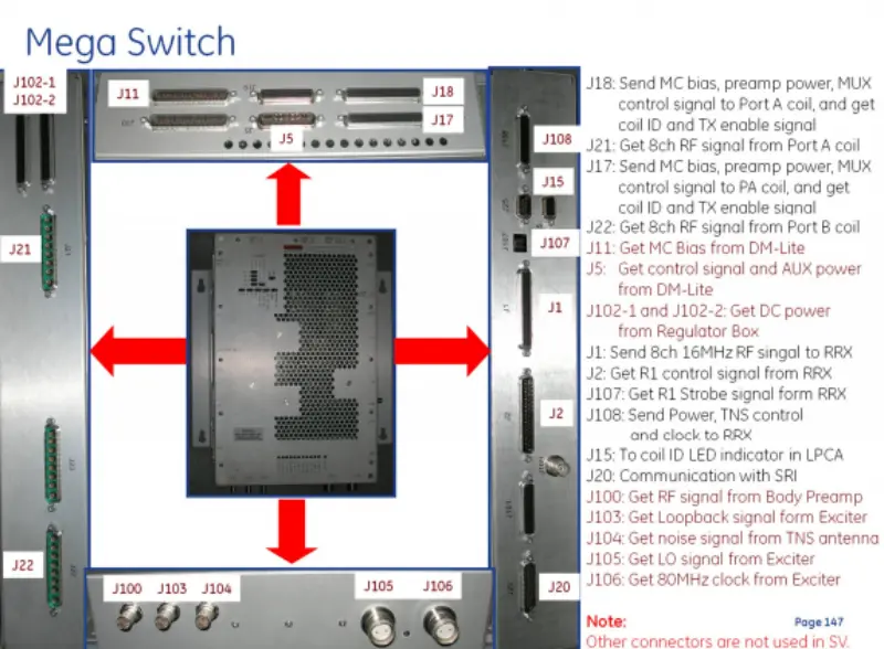 SRI байланысы (J20): SRI сыртқы сигнал кірістерімен деректер алмасуды қосады (J100, J103-J106): Body Preamp-тен РЖ сигналдарын, қоздырғыштан кері цикл сигналдарын, TNS антеннасынан шу сигналдарын, LO сигналдарын және Exciter-ден 80 МГц сағатын алу